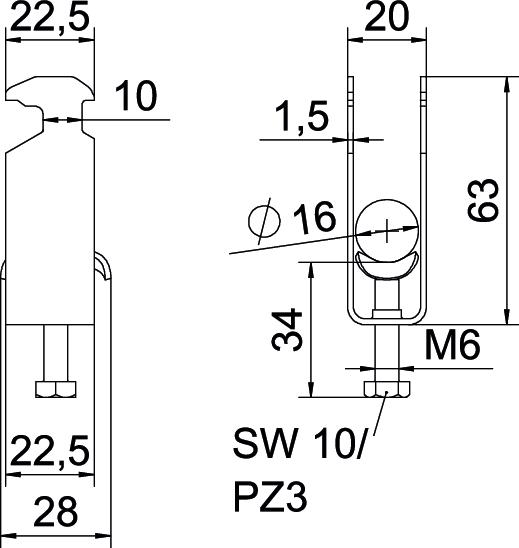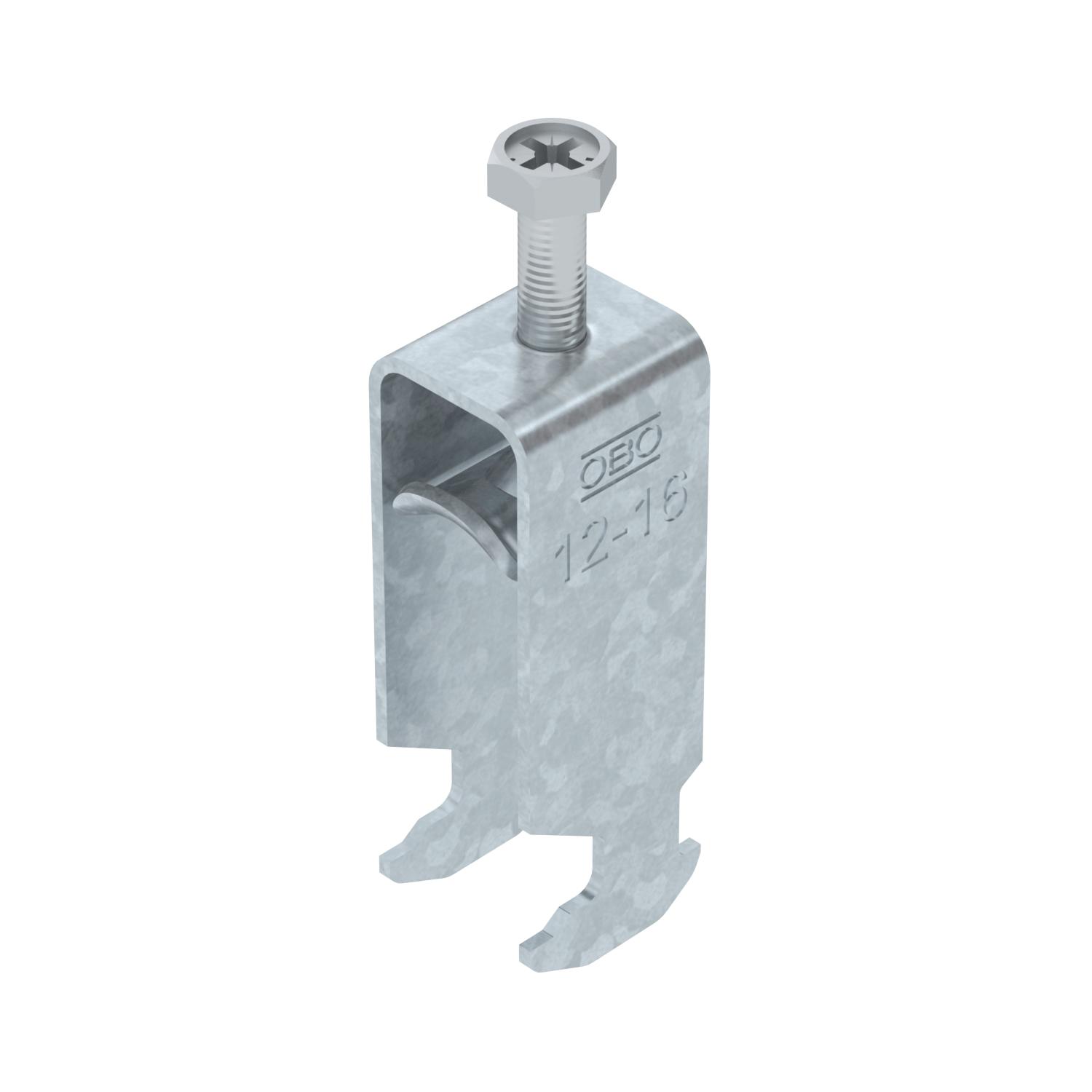 Opis proizvodaLučna obujmica sa čekićastom stopom, metalno pritisno korito sa zaobljenim ivicama radi zaštite kabla. Za vertikalnu i horizontalnu montažu 2 pojedinačna kabla na C-profilnu šinu. Za širinu proreza 16 - 17 mm. Pomoću zavrtnja sa 1-strukim navojem pričvrstiti na pritisno korito, univerzalna šestostrana glava zavrtnja SW10, sa ravnim ili krstastim prorezom. Pogodno za montažu u zatvorenom i na otvorenom prostoru. Više kablova treba odvojiti dvostrukim koritom. Preporučuje se upotreba kontrakadice