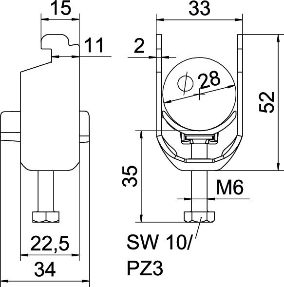Opis proizvodaLučna obujmica sa N-stopom, plastično pritisno korito od polipropilena. Za vertikalnu i horizontalnu montažu jednog pojedinačnog kabla na C-šinu Za širinu proreza 11 - 12 mm. Pomoću zavrtnja sa 1-strukim navojem pričvrstiti na pritisno korito, univerzalna šestostrana glava zavrtnja SW10, sa ravnim ili krstastim prorezom. Pogodno za montažu u zatvorenom i na otvorenom prostoru. Preporučuje se upotreba kontrakadice