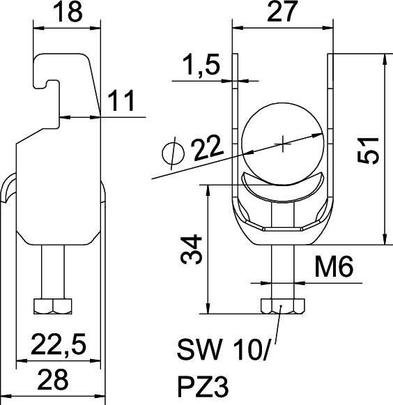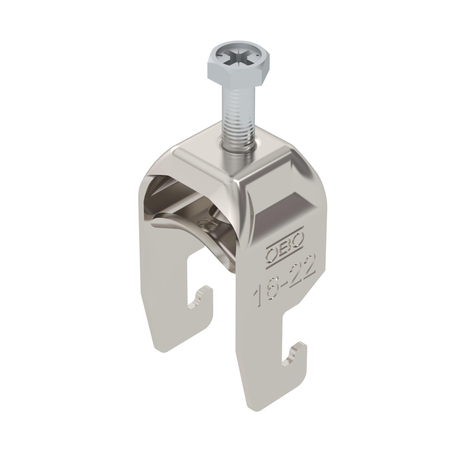 Opis proizvodaLučna obujmica sa U-stopom, metalno pritisno korito sa zaobljenim ivicama radi zaštite kabla. Za vertikalnu i horizontalnu montažu jednog pojedinačnog kabla na C-šinu Za širinu proreza 18 - 22 mm. Pomoću zavrtnja sa 1-strukim navojem pričvrstiti na pritisno korito, univerzalna šestostrana glava zavrtnja SW10, sa ravnim ili krstastim prorezom. Pogodno za montažu u zatvorenom i na otvorenom prostoru. Preporučuje se upotreba kontrakadice