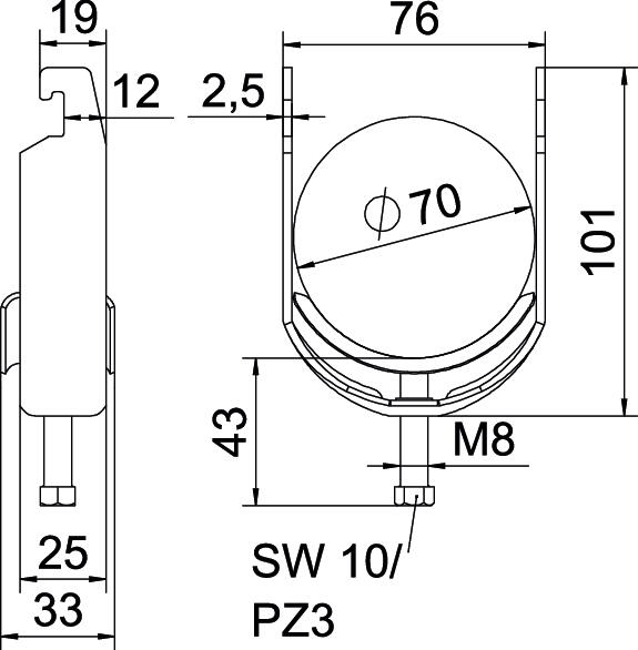 Opis proizvodaLučna obujmica sa U-stopom, metalno pritisno korito sa zaobljenim ivicama radi zaštite kabla. Za vertikalnu i horizontalnu montažu jednog pojedinačnog kabla na C-šinu Za širinu proreza 18 - 22 mm. Pomoću zavrtnja sa 1-strukim navojem pričvrstiti na pritisno korito, univerzalna šestostrana glava zavrtnja SW10, sa ravnim ili krstastim prorezom. Pogodno za montažu u zatvorenom i na otvorenom prostoru. Preporučuje se upotreba kontrakadice