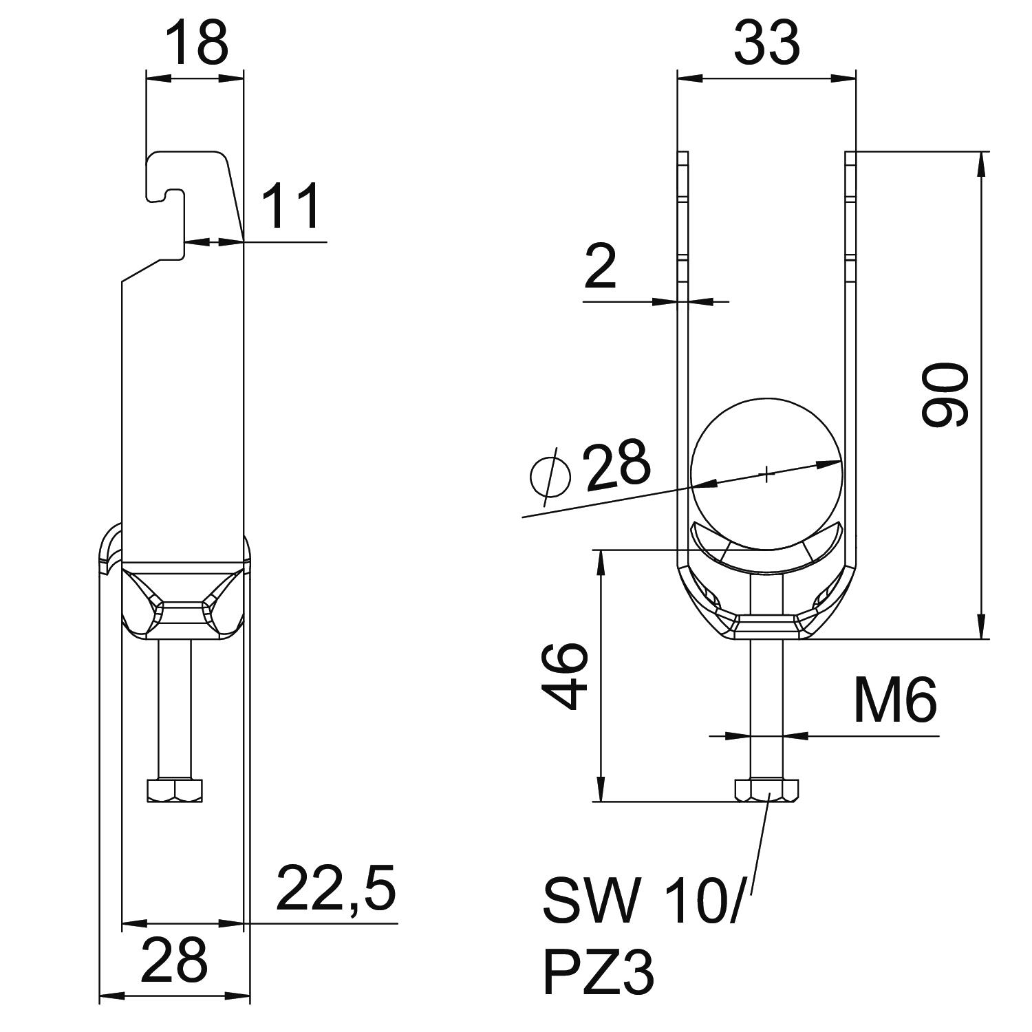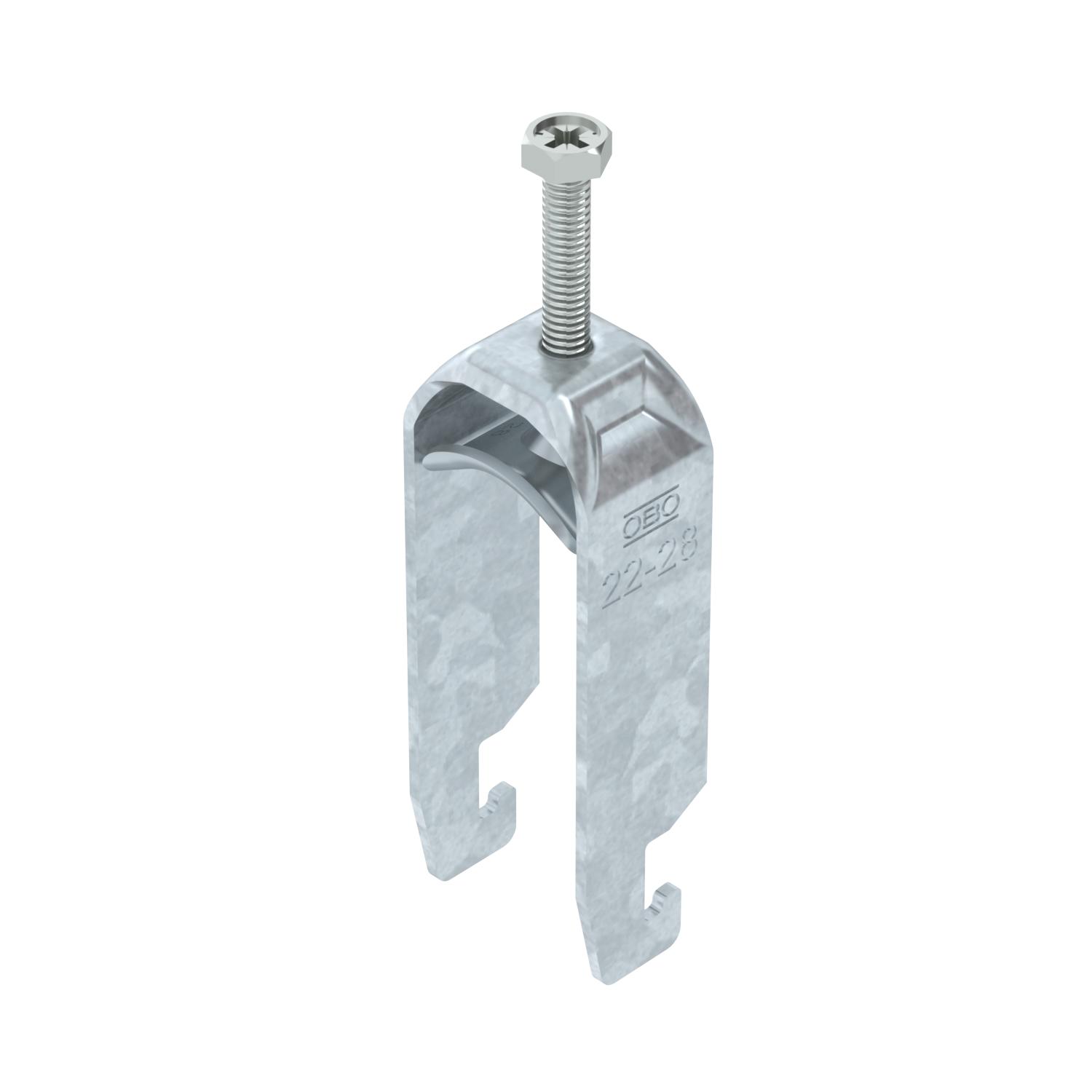 Opis proizvodaLučna obujmica sa U-stopom, metalno pritisno korito sa zaobljenim ivicama radi zaštite kabla. Za vertikalnu i horizontalnu montažu 2 pojedinačna kabla na C-profilnu šinu. Za širinu proreza 18 - 22 mm. Pomoću zavrtnja sa 1-strukim navojem pričvrstiti na pritisno korito, univerzalna šestostrana glava zavrtnja SW10, sa ravnim ili krstastim prorezom. Pogodno za montažu u zatvorenom i na otvorenom prostoru. Više kablova treba odvojiti dvostrukim koritom. Preporučuje se upotreba kontrakadice