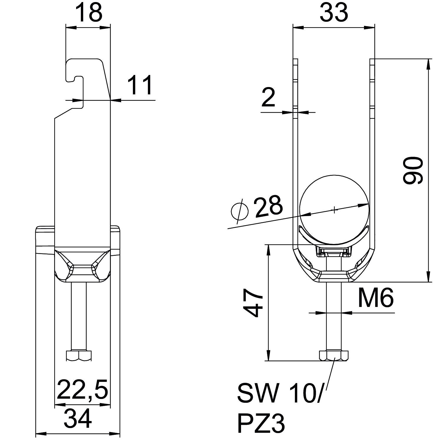 Opis proizvodaLučna obujmica sa U-stopom, plastično pritisno korito od polipropilena. Za vertikalnu i horizontalnu montažu 2 pojedinačna kabla na C-profilnu šinu. Za širinu proreza 18 - 22 mm. Pomoću zavrtnja sa 1-strukim navojem pričvrstiti na pritisno korito, univerzalna šestostrana glava zavrtnja SW10, sa ravnim ili krstastim prorezom. Pogodno za montažu u zatvorenom i na otvorenom prostoru. Više kablova treba odvojiti dvostrukim koritom. Preporučuje se upotreba kontrakadice