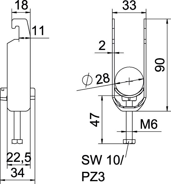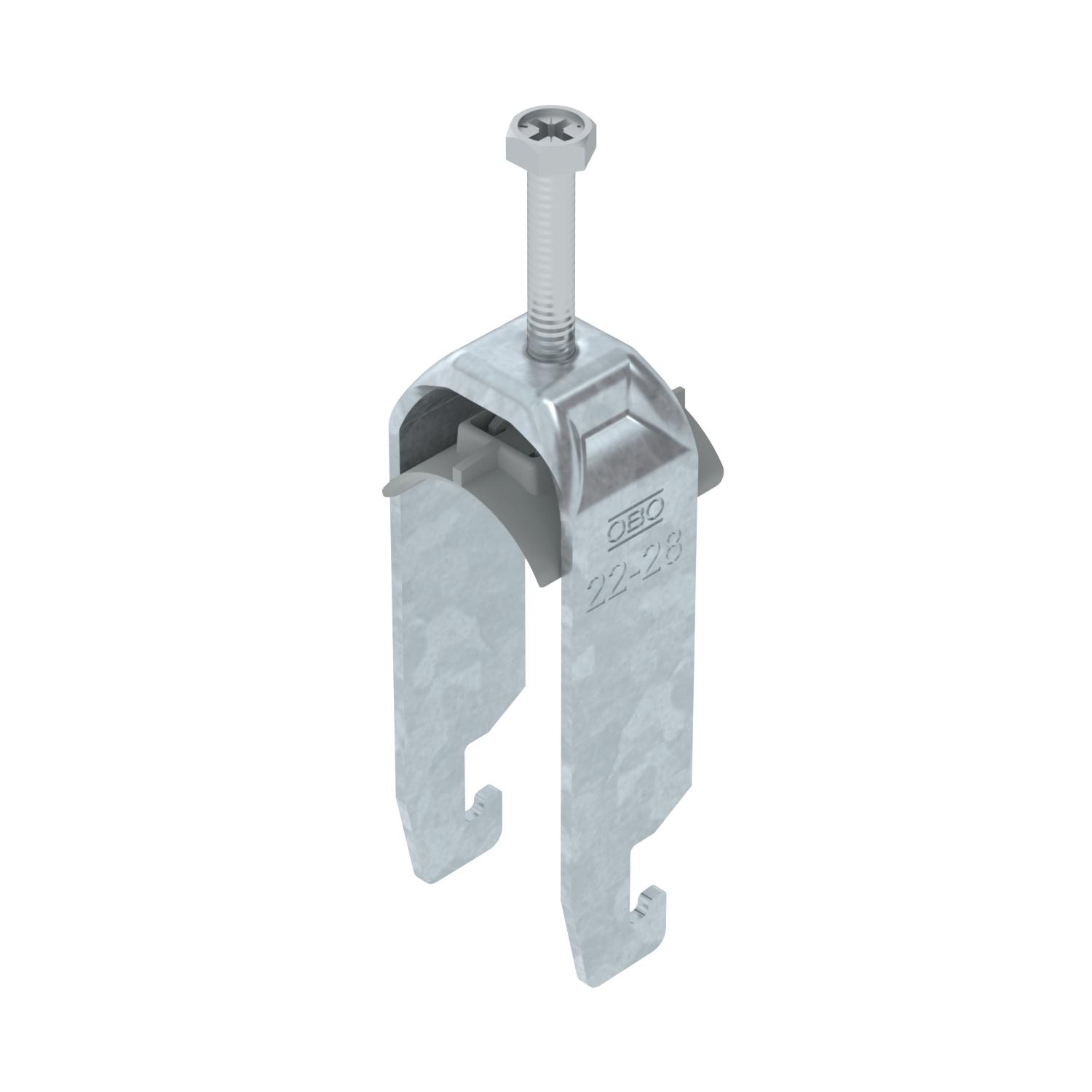 Opis proizvodaLučna obujmica sa U-stopom, plastično pritisno korito od polipropilena. Za vertikalnu i horizontalnu montažu 2 pojedinačna kabla na C-profilnu šinu. Za širinu proreza 18 - 22 mm. Pomoću zavrtnja sa 1-strukim navojem pričvrstiti na pritisno korito, univerzalna šestostrana glava zavrtnja SW10, sa ravnim ili krstastim prorezom. Pogodno za montažu u zatvorenom i na otvorenom prostoru. Više kablova treba odvojiti dvostrukim koritom. Preporučuje se upotreba kontrakadice