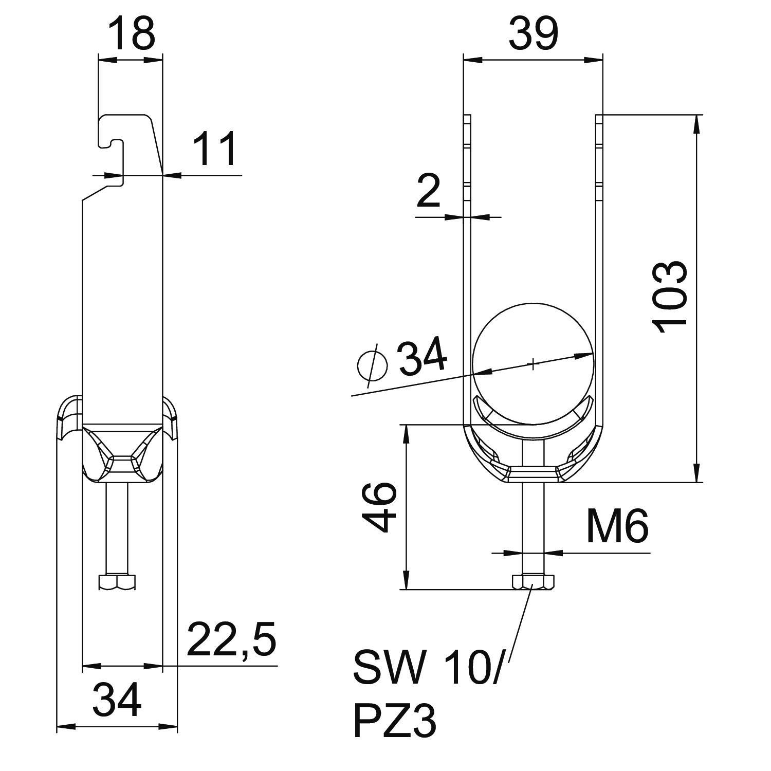 Opis proizvodaLučna obujmica sa U-stopom, metalno pritisno korito sa zaobljenim ivicama radi zaštite kabla. Za vertikalnu i horizontalnu montažu 3 pojedinačna kabla na C-profilnu šinu. Za širinu proreza 18 - 22 mm. Pomoću zavrtnja sa 1-strukim navojem pričvrstiti na pritisno korito, univerzalna šestostrana glava zavrtnja SW10, sa ravnim ili krstastim prorezom. Pogodno za montažu u zatvorenom i na otvorenom prostoru. Više kablova treba odvojiti dvostrukim koritom. Preporučuje se upotreba kontrakadice