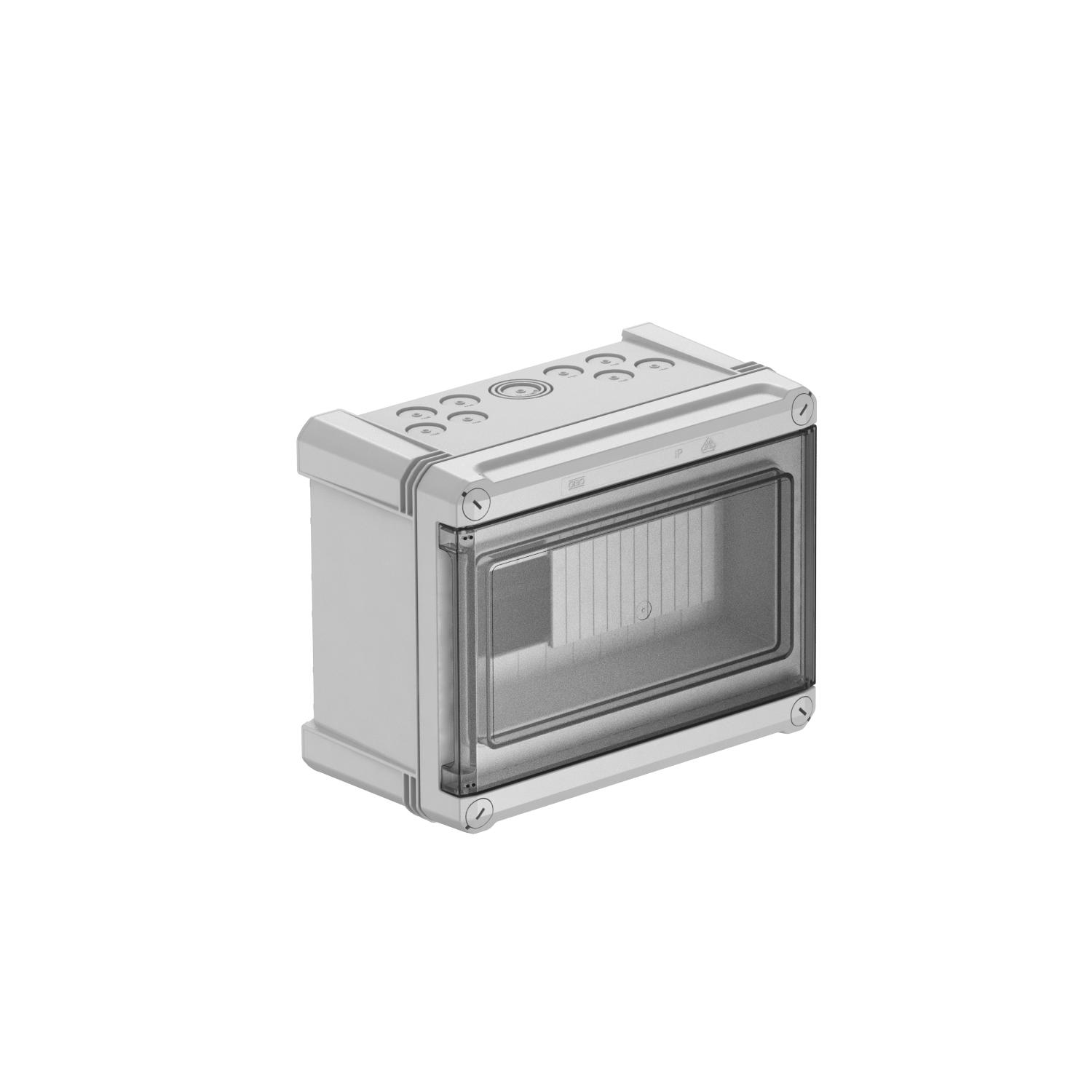 Opis proizvodaMala razvodna tabla za nadzirnu montažu za potpodelu struje u unutrašnjem i spoljašnjem prostoru prema IEC 439-3. Sa prethodno montiranom profilnom šinom od 35 mm. Tip zaštite IP66 i stepen zaštite IK08. Transparentni poklopac za uvrtanje vijaka, sa prorezom. Uključujući 4 zaštitne kapice za vijke.