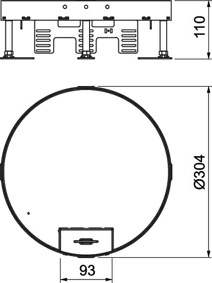 Opis proizvodaMetalna podna kutija sa stopicama sa izlazom za kabl nominalne veličine R9 za ugradnju instalacionih uređaja u podove sa suvim održavanjem u unutrašnjim oblastima.