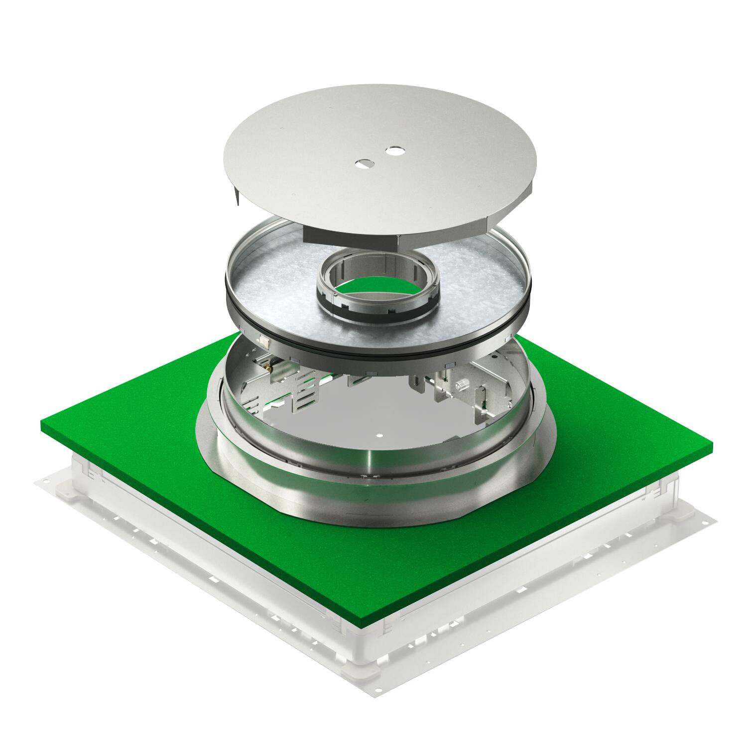 Opis proizvodaOkrugle metalne podne kutije sa nivelacijom i mogućnosti odvajanja pogodne su za ugradnju uređaja u ravni sa podom u podno kućište UGD-3. U zavisnosti od varijante, pogoduju za podove sa suvim, mokrim i vlažnim održavanjem. Metalna podna kutija oslanja se na pričvrsni ugaonik koji je fiksiran u gornjem ramu kućišta, preko kog metalna podna kutija može da se podešava i prema gornjoj ivici podne obloge. Preko pričvrsnog ugaonika, metalna podna kutija može da se odvoji od donjeg sloja poda. Podno kućište mora da raspolaže odgovarajućim ugradnim otvorom i iz tog razloga potreban mu je adaptacioni poklopac sa odgovarajućim ugradnim otvorom. Metalne podne kutije napravljene su od oplemenjenog čelika ili mesinga. Sve metalne podne kutije sadrže 4 mm debelu ploču od čeličnog lima kako bi sigurno preuzele opterećenja na frekventnim mestima. Metalne podne kutije prave se za različite debljine podnih obloga od 20 i 25 mm.