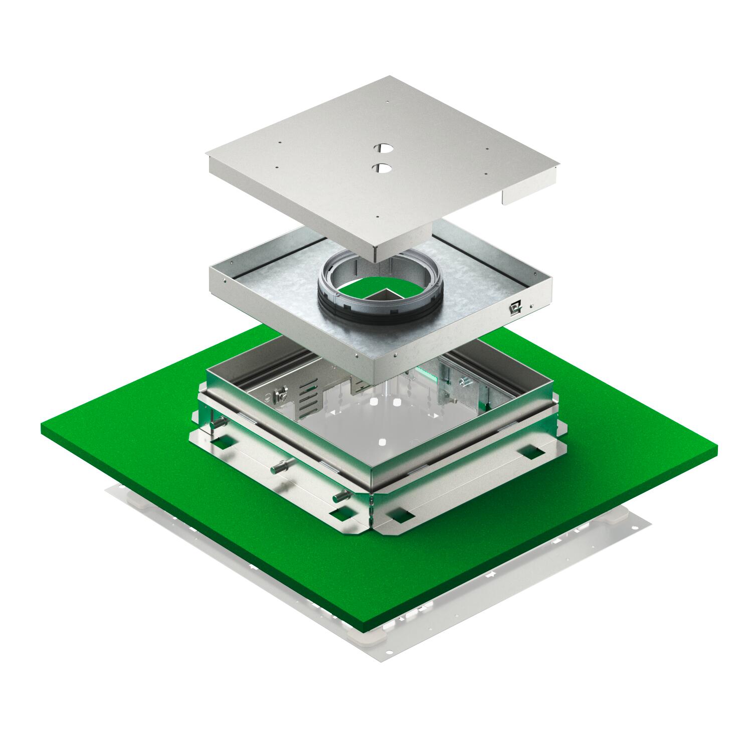 Opis proizvodaKvadratne nivelirajuće kazete, odvojive, za ugradnju elektroelemenata u kutije u razini poda i bez priljubnica UZD 250-3 (minimalna ugradbena dubina 151 mm) / UGD55 250-3 (minimalna ugradbena dubina 136 mm). Prikladno za sve cementne glazure. Okvir kazete s integriranom oplatom i funkcijom niveliranja. Okvir kazete nivelira se preko 4 proreza na gornji rub podne obloge. Prikladno za podove sa suhim, vlažnim ili mokrim održavanjem. Kazeta se fiksira pričvrsnim nosačima u montažnom poklopcu tijekom radova na glazuri / terazzu i odvaja se u svim smjerovima kada je instalirana. Okvir kazete izrađen je od nehrđajućeg čelika s poklopcem s upuštenjem za podnu oblogu veličine 25 mm.