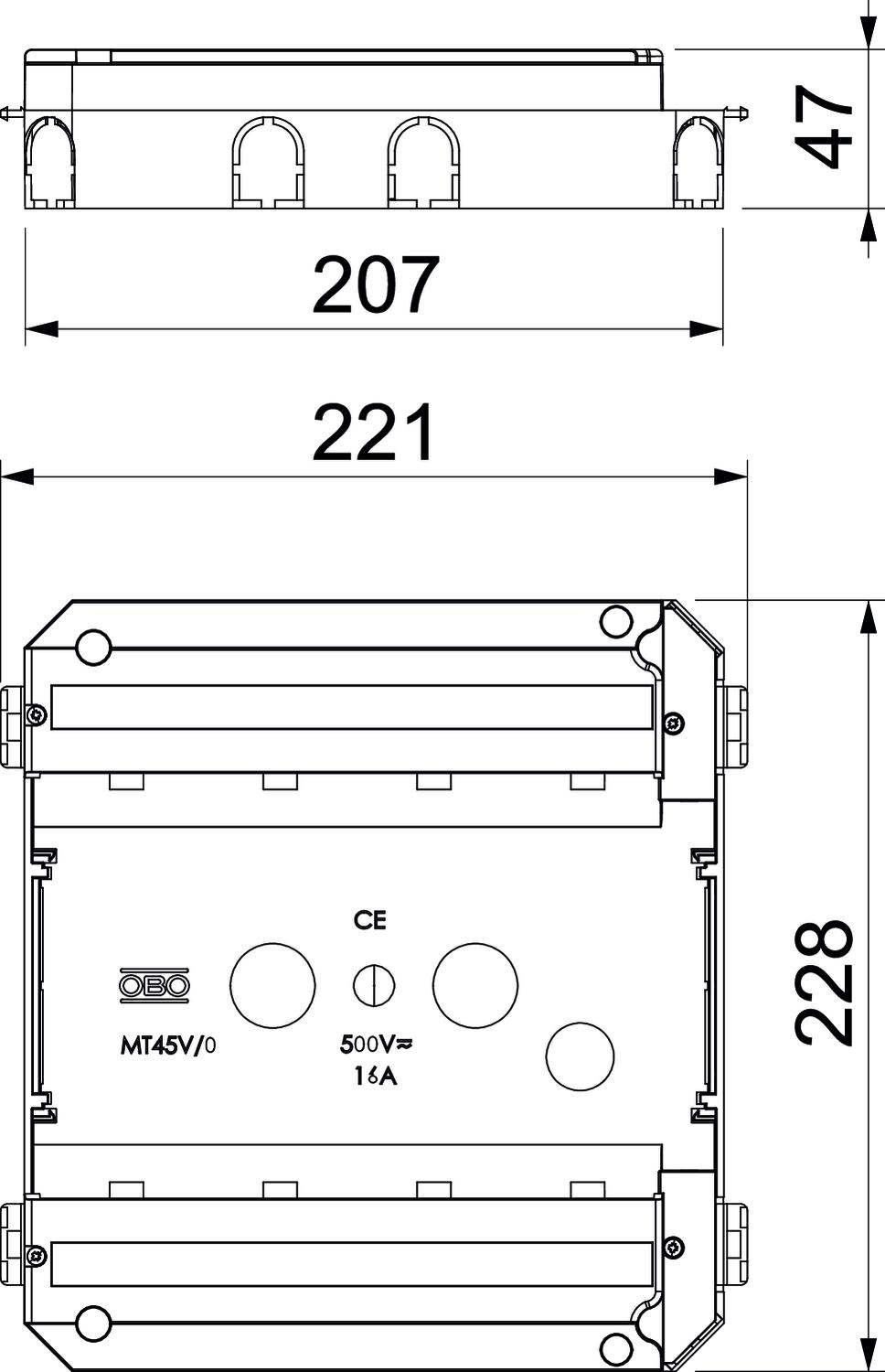 Montažni okvir MT45V za ugradnju Modul 45 uređaja i MPMT45 montažne ploče za data utičnice mogu se naručiti posebno. Rupe na bočnom zidu za ulaz cevi imaju prečnik od 21 mm.