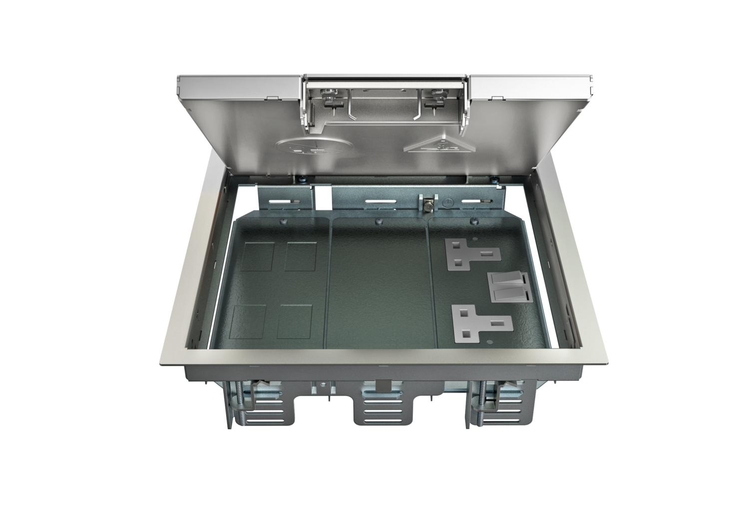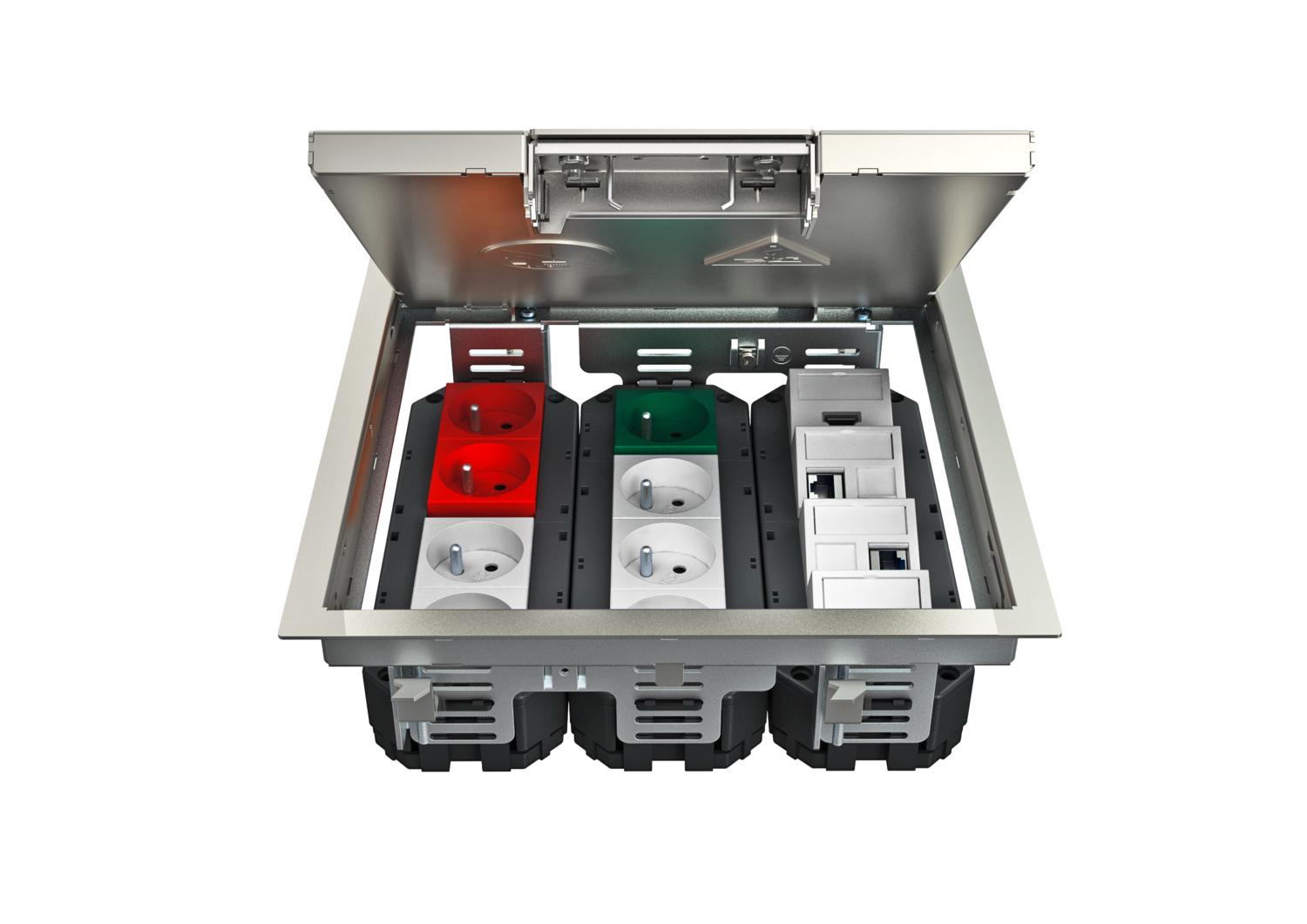 Opis proizvodaPodna kutija sa lučnom drškom za do 12 Modul 45-pojedinačnih uređaja u 3 univerzalna nosača UT4, primena u sistemima kanala i sistemskim podovima u unutrašnjim oblastima.