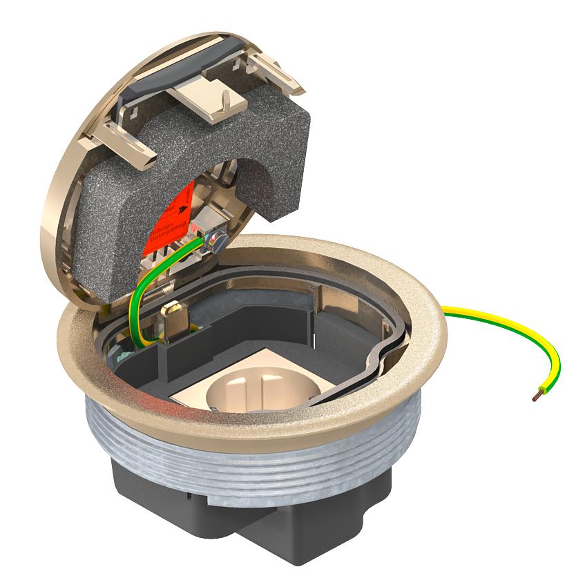Opis proizvodaOkrugla instalaciona jedinica sa zaštitnim okvirom za podnu oblogu za direktnu ugradnju u kućište UDL2-120 u unutrašnjoj oblasti. Instalaciona jedinica opremljena je jednostrukom belom utičnicom, povezanom. Ugradna jedinica se može mokro čistiti kada je zatvorena. Minimalna dubina ugradnje je 70 mm.