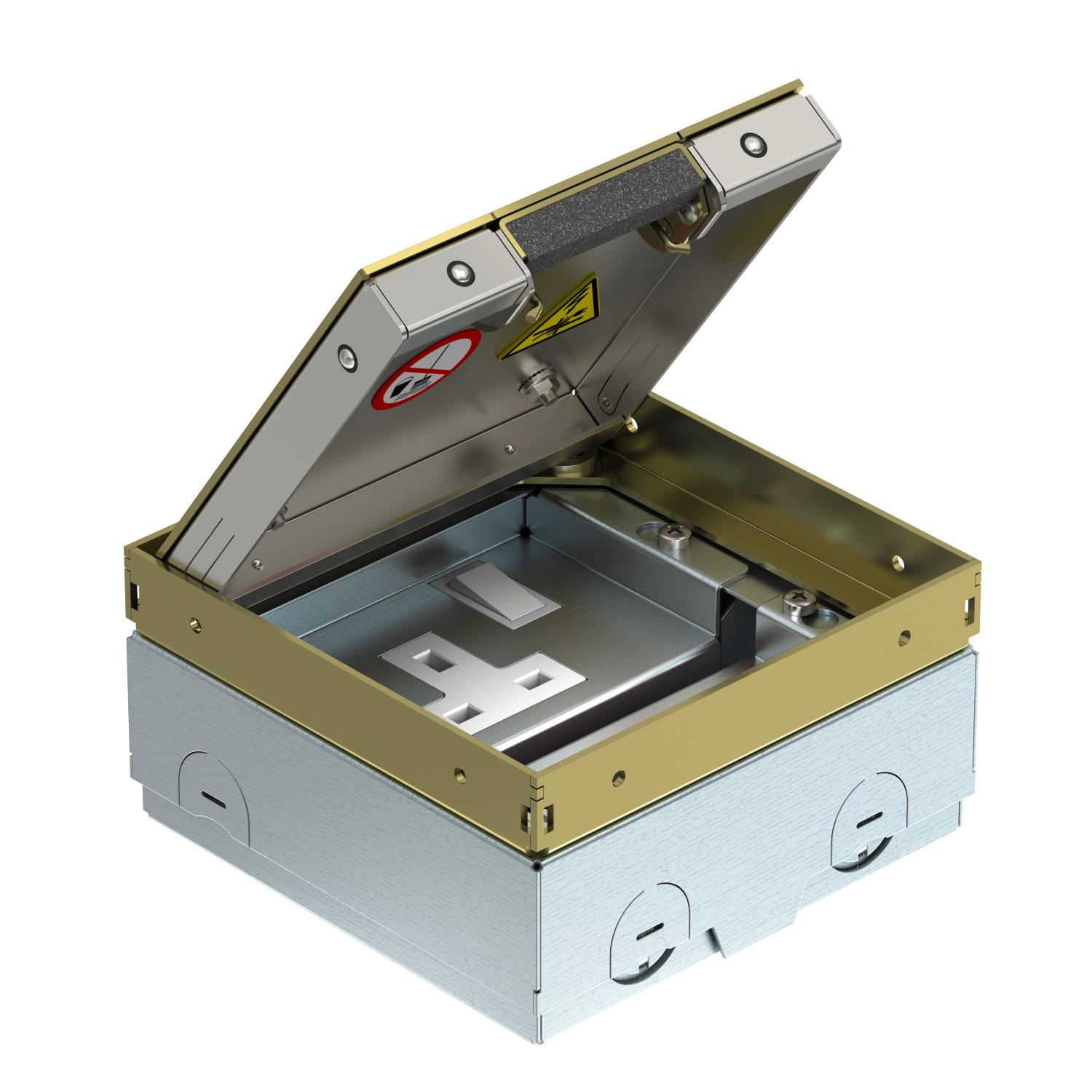 Opis proizvodaKvadratna podna kutija za upotrebu u sistemima koji se održavaju na suvo i podovima sa košuljicom u zatvorenom prostoru. Ugradno kućište sa obeleženim uvodnim otvorima za cevi (M20/M25). Gornji deo može se podesiti do gornje ivice podne obloge pomoću 4 nosača za izravnavanje. Minimalna dubina ugradnje je 75 mm, opseg nivelisanja je + 30 mm. Okvir i poklopac od mesinga vidljivi u podnoj oblozi. Poklopac sa ukrasnom pločom. Nosivost od 15 kN je zagarantovana samo kada se ne koristi. Obim isporuke uključuje komutiranu BS utičnicu i nosač tehnologije podataka za 2 LJU6C utičnice za podatke.