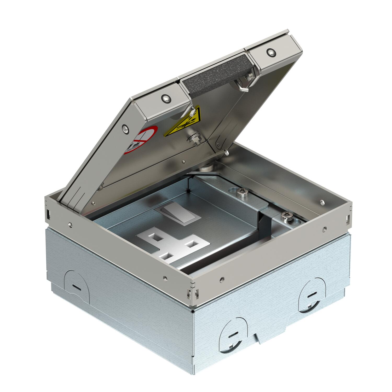 Opis proizvodaKvadratna podna kutija za upotrebu u sistemima koji se održavaju na suvo i podovima sa košuljicom u zatvorenom prostoru. Ugradno kućište sa obeleženim uvodnim otvorima za cevi (M20/M25). Gornji deo može se podesiti do gornje ivice podne obloge pomoću 4 nosača za izravnavanje. Minimalna dubina ugradnje je 75 mm, opseg nivelisanja je + 30 mm. Okvir i poklopac od nerđajućeg čelika vidljivi u podu. Poklopac sa ukrasnom pločom. Nosivost od 15 kN je zagarantovana samo kada se ne koristi. Obim isporuke uključuje komutiranu BS utičnicu i nosač tehnologije podataka za 2 LJU6C utičnice za podatke.