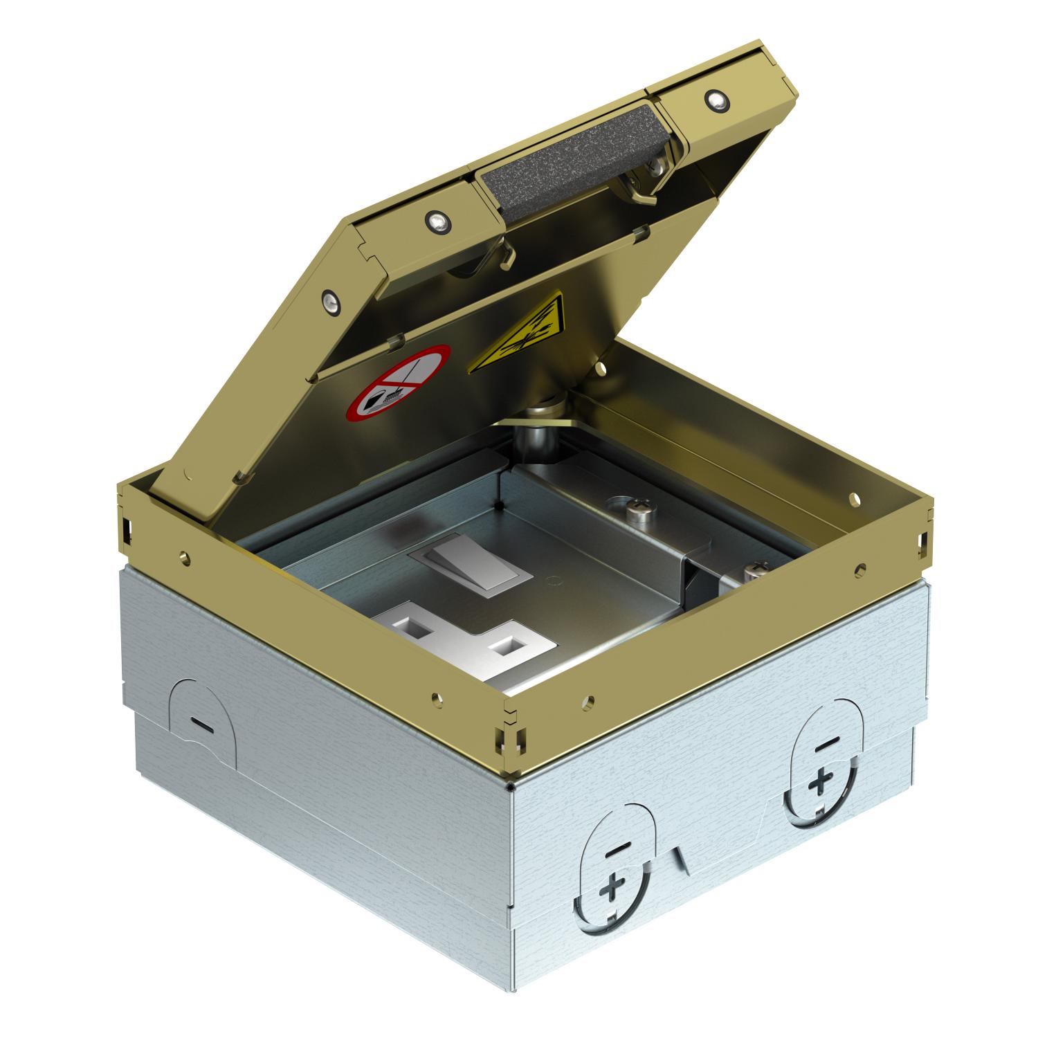 Opis proizvodaKvadratna podna kutija za upotrebu u sistemima koji se održavaju na suvo i podovima sa košuljicom u zatvorenom prostoru. Ugradno kućište sa obeleženim uvodnim otvorima za cevi (M20/M25). Gornji deo može se podesiti do gornje ivice podne obloge pomoću 4 nosača za izravnavanje. Minimalna ugradna dubina iznosi 85 mm, nivelaciona oblast + 20 mm. Okvir i poklopac od mesinga vidljivi u podnoj oblozi. Poklopac sa udubljenjem za podne obloge. Nosivost od 15 kN je zagarantovana samo kada se ne koristi. Obim isporuke uključuje komutiranu BS utičnicu i nosač tehnologije podataka za 2 LJU6C utičnice za podatke.