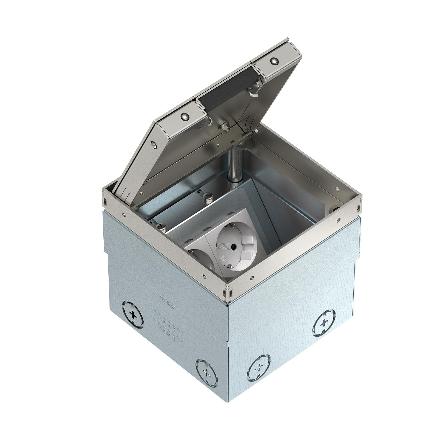 Okvir i poklopac od nerđajućeg čelika vidljivi u podu. Sa 2 Modul 45® utičnice u montažnom nosaču i opcionim nosačem za tehnologiju podataka za do 2 modula za povezivanje podataka. Nosivost od 15 kN je zagarantovana samo kada se ne koristi.