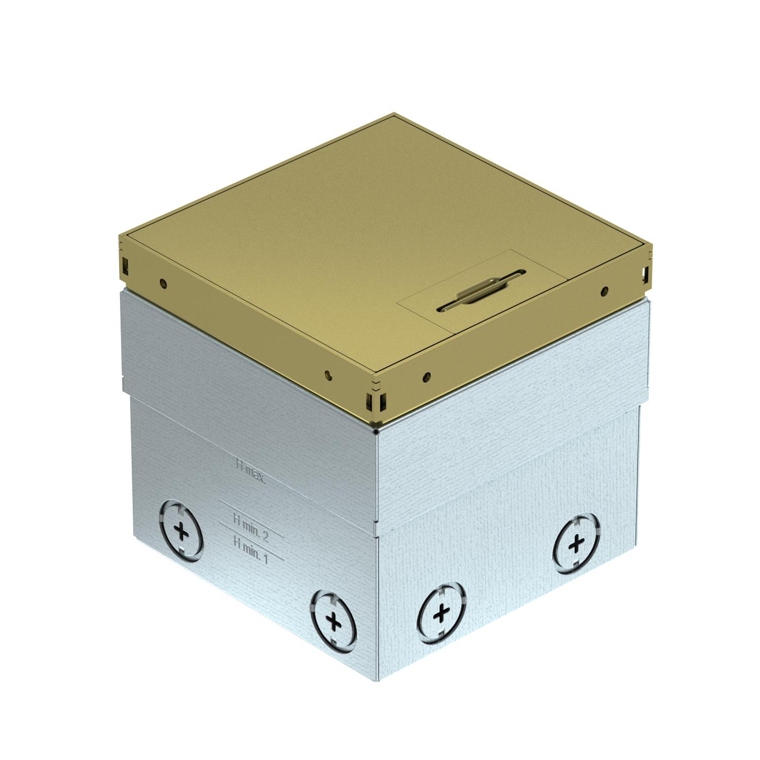 Okvir i poklopac od mesinga vidljivi u podnoj oblozi. Prazno kućište za do 2 Modul 45® ugrađena uređaja u montažnom nosaču i 2 utičnice za prenos podataka u opcionom nosaču za tehnologiju podataka. Nosivost od 15 kN je zagarantovana samo kada se ne koristi.