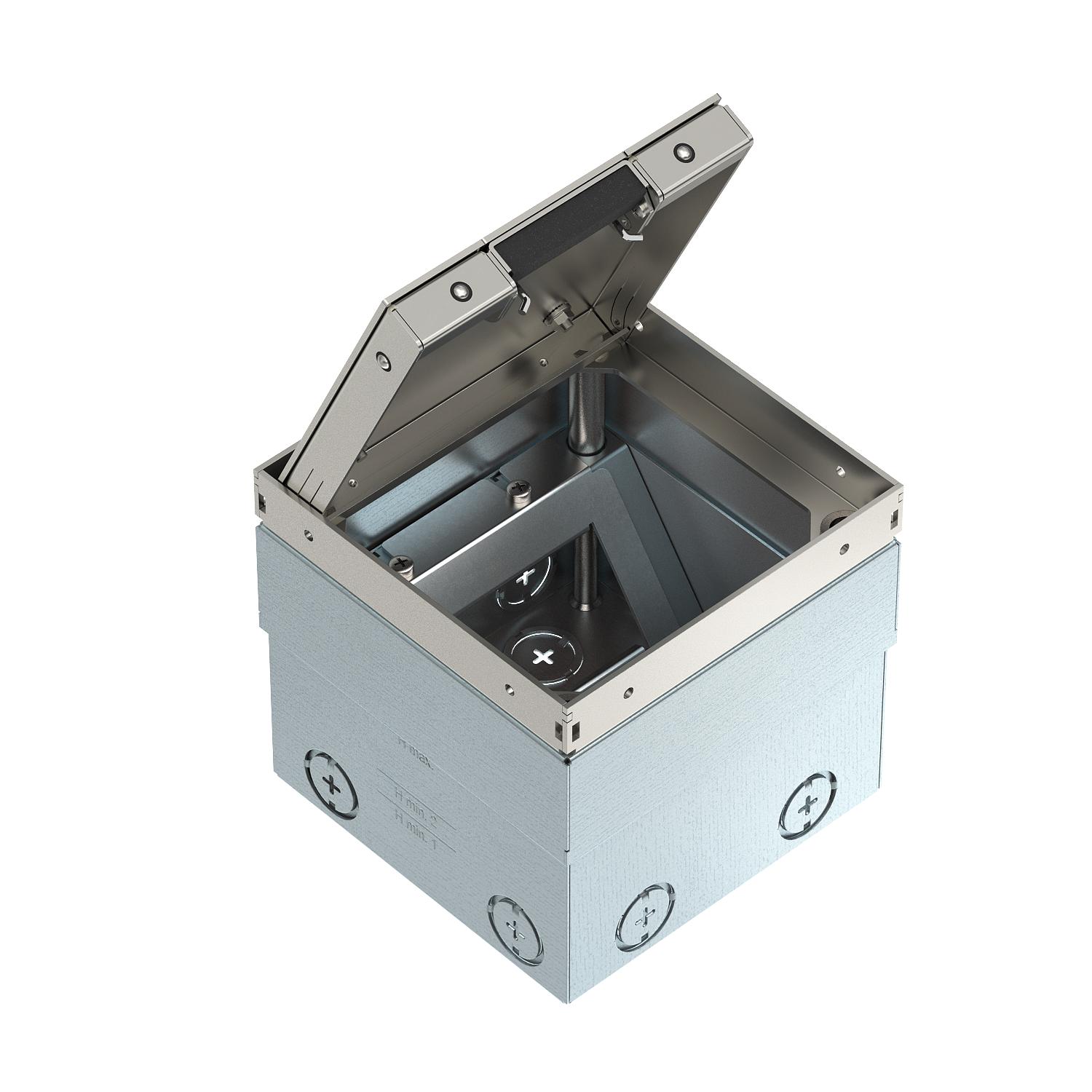 Okvir i poklopac od nerđajućeg čelika vidljivi u podu. Prazno kućište za do 2 Modul 45® ugrađena uređaja u montažnom nosaču i 2 utičnice za prenos podataka u opcionom nosaču za tehnologiju podataka. Nosivost od 15 kN je zagarantovana samo kada se ne koristi.