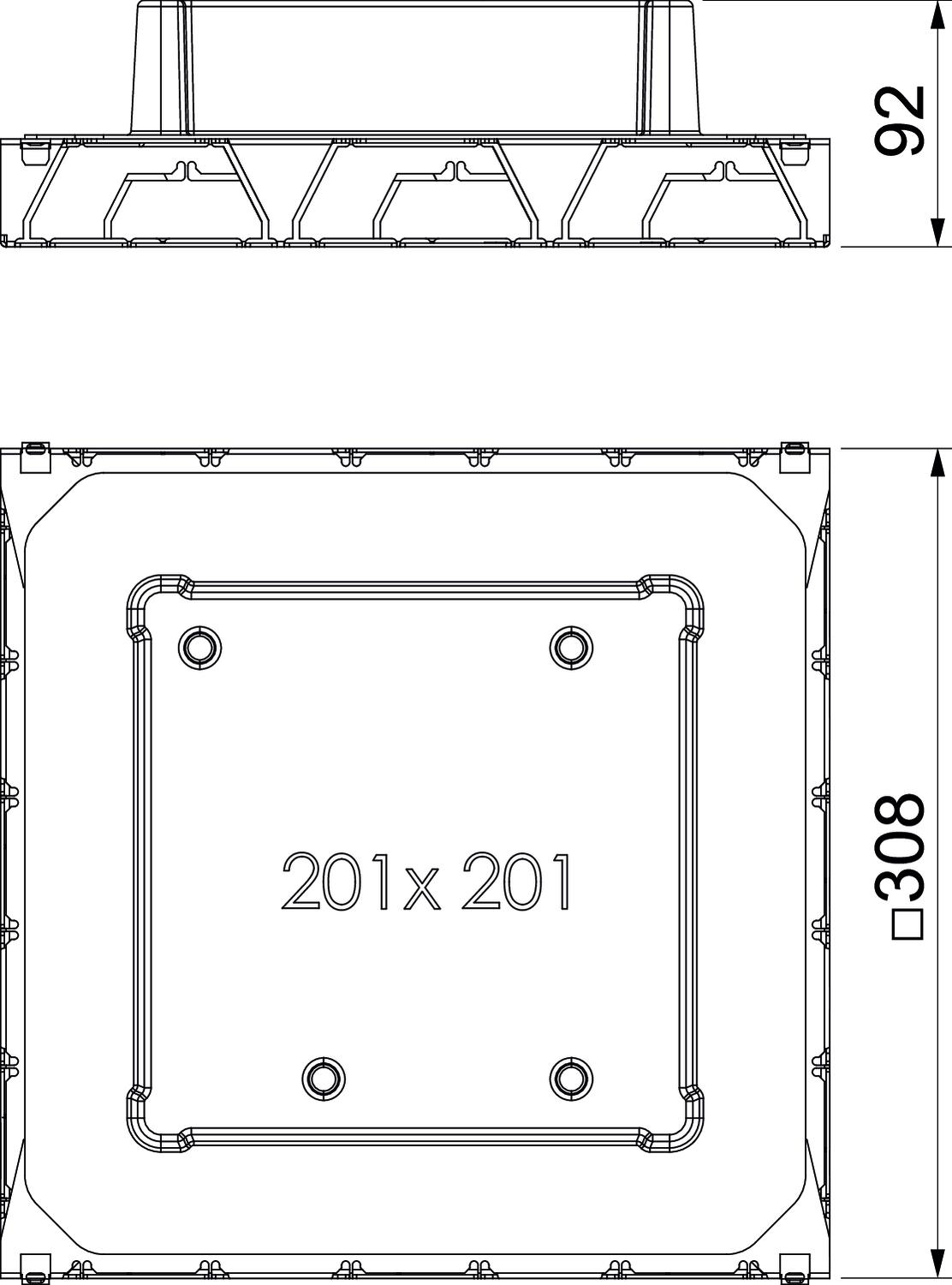 Opis proizvodaPodna kutija sa fiksnim i nepromenljivim ugradnim otvorom 201 x 201 mm za ugradnu jedinicu nominalne veličine 4. Montažni otvor se pravi pomoću ograničenog tela sadržanog u obimu isporuke. Podna kutija raspolaže ugradnim otvorima za po tri 1-delna PVC kanala nominalne veličine 60 x 25 i 90 x 35 na sve četiri strane. Kutija je generalno pogodna za primenu u nadgradnjama poda sa košuljicom od cementa, visine nadgradnje do 90 mm.