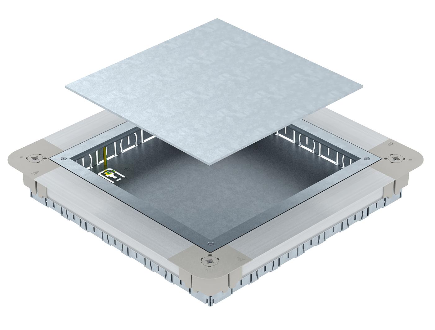 Opis proizvodaPodna kutija uređaja sa montažnim poklopcem i maskirnom pločom poklopca sa bočnim stranicama od čeličnog lima. Za ugradnju pravougaonih priključaka za uređaje GES9 55 u betonske košuljice visine od 55 mm. Može da se niveliše bestepeno na visinu betonske košuljice, a betonska košuljica može da se obradi u ravni sa ivicom poda. Sa otvorima za uvođenje cevi sa svake strane 7 x M20, 3 x M25, 4 x M32. Korisna veličina cevi pri sistemskoj visini od 55 mm: M20.