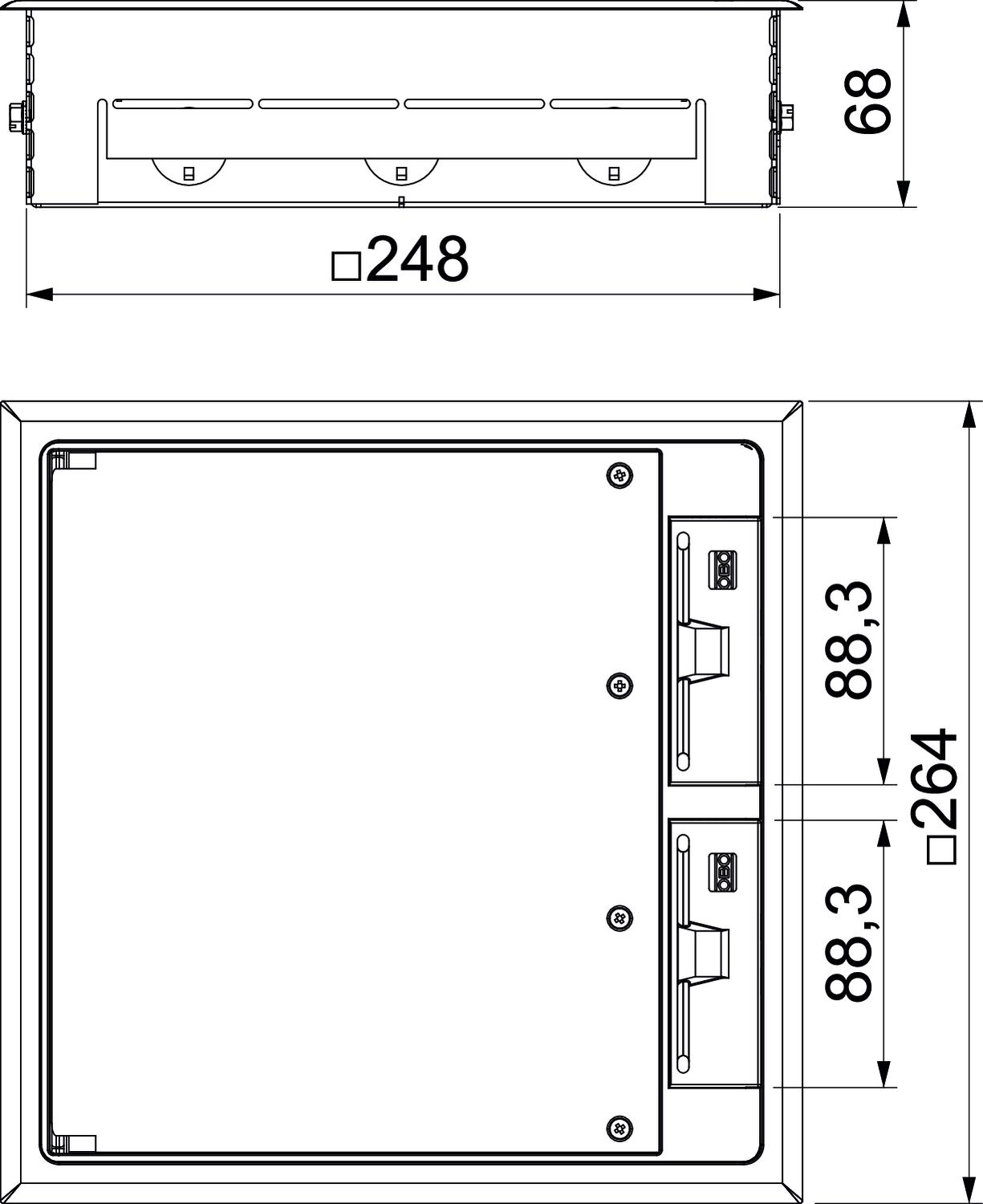 Opis proizvodaKvadratno kućište za košuljicu sa podnom kutijom GES9 UGE za upotrebu u podovima sa betonskom košuljicom u unutrašnjim oblastima. Sa obeleženim otvorima za uvođenje cevi za provodnike (M20/M25) sa sve četiri strane.