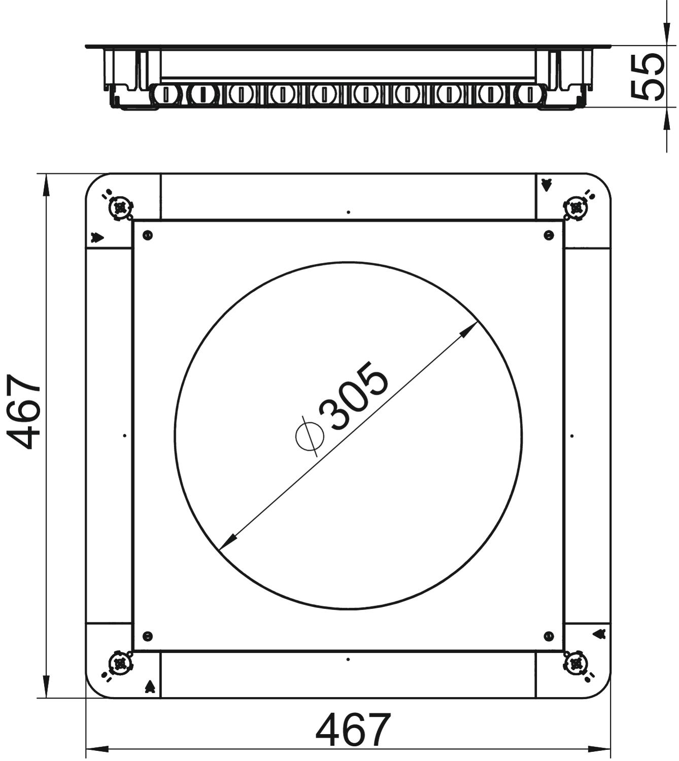 Opis proizvodaPodna kutija uređaja sa montažnim poklopcem i maskirnom pločom poklopca sa bočnim stranicama od čeličnog lima. Za ugradnju pravougaonih priključaka za uređaje GES9 55 u betonske košuljice visine od 55 mm. Može da se niveliše bestepeno na visinu betonske košuljice, a betonska košuljica može da se obradi u ravni sa ivicom poda. Sa otvorima za uvođenje cevi sa svake strane 7 x M20, 3 x M25, 4 x M32. Korisna veličina cevi pri sistemskoj visini od 55 mm: M20.