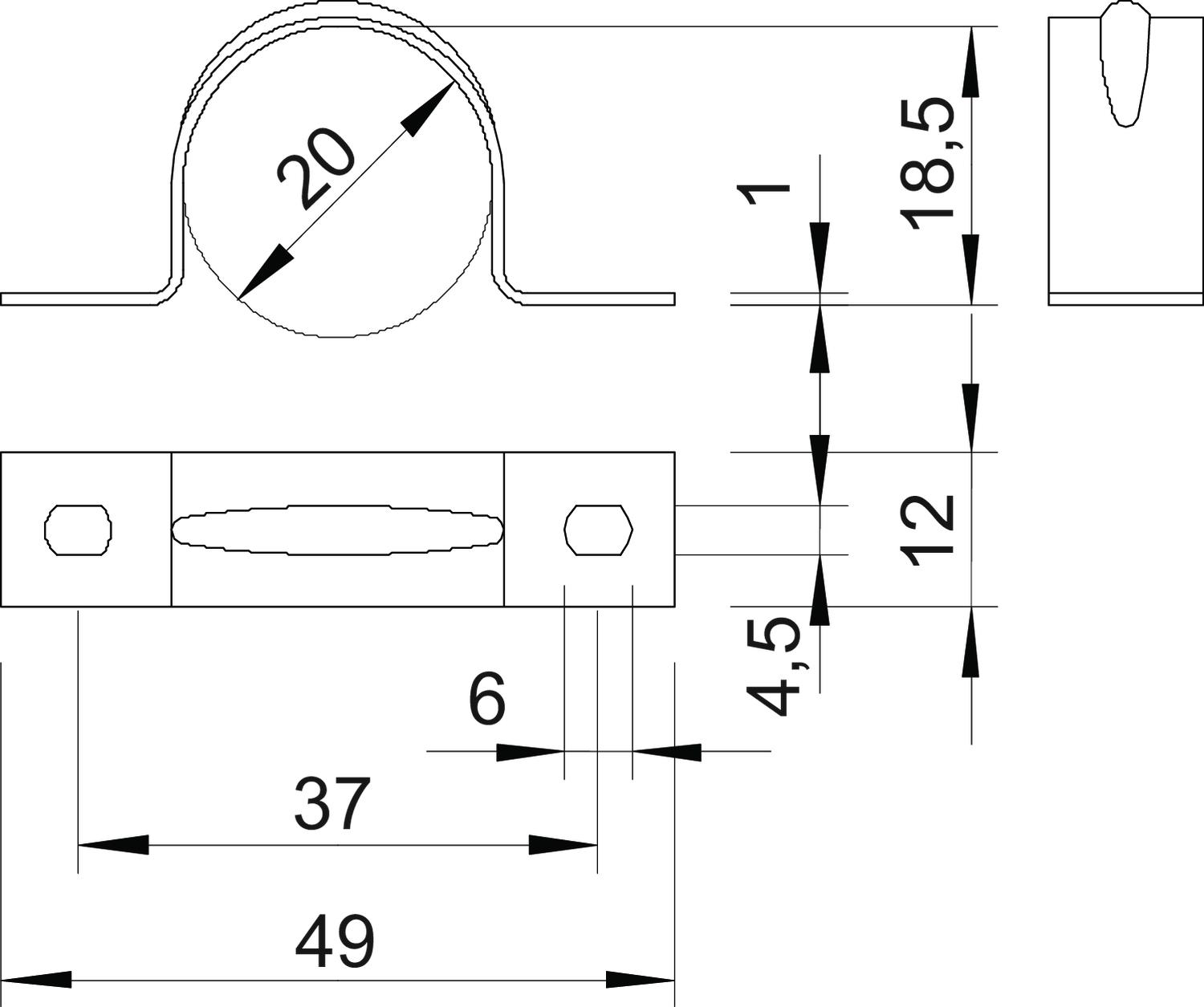 bez halogena da Broj kablova/cevi 1 CO2 otisak (GWP) od kolevke do kapije 0,043 kg CO2e / 1 Komad Debljina materijala 1 mm Dimenzija 20mm Dimenzija A 49 mm Dimenzija B 37 mm Dimenzija b 12 mm Dimenzija D 4,5 mm Dimenzija D 20 mm Dimenzija E 6 mm Dimenzija H 18,5 mm Dimenzija t 1 mm Dužina 49 mm Materijal Aluminijum Nominalni prečnik 20 mm Omotano plastikom ne Pogoduje za protivpožarnu oblast ne Rastojanje od zida ne Širina 12 mm UL-postojani da Varijanta dvostruko presavijeno Veličina rupe 4,5 x 6 mm Visina 18,5 mm Vrsta pričvršćivanja Rupa za navojno pričvršćivanje za prečnik 20 Zatezna oblast D maks. 20 mm Zatezna oblast D min. 20 mm - Svi tipovi