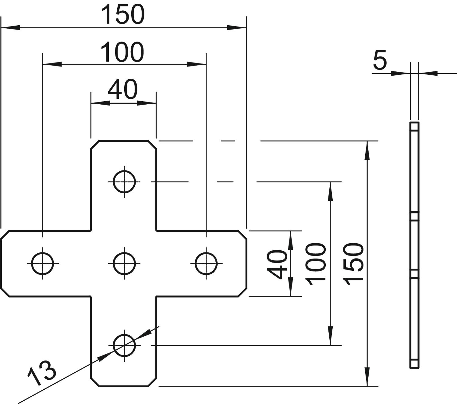 Opis proizvodaPriključna ploča sa 5 rupa za unakrsno spajanje profilnih šina 41 x 41 mm i 41 x 21 mm.