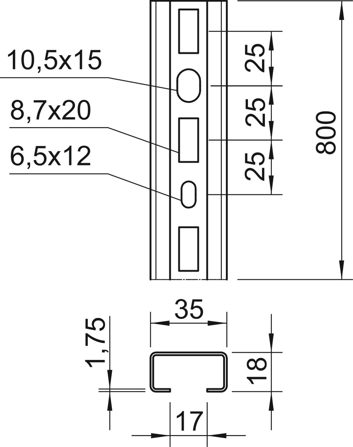 Opis proizvodaSrednja C profilna šina za postavljanje kablova, u spoju sa lučnim obujmicama sa stopom u obliku čekića. Primenljiva i kao viseća konstrukcija za sisteme nosača kablova.