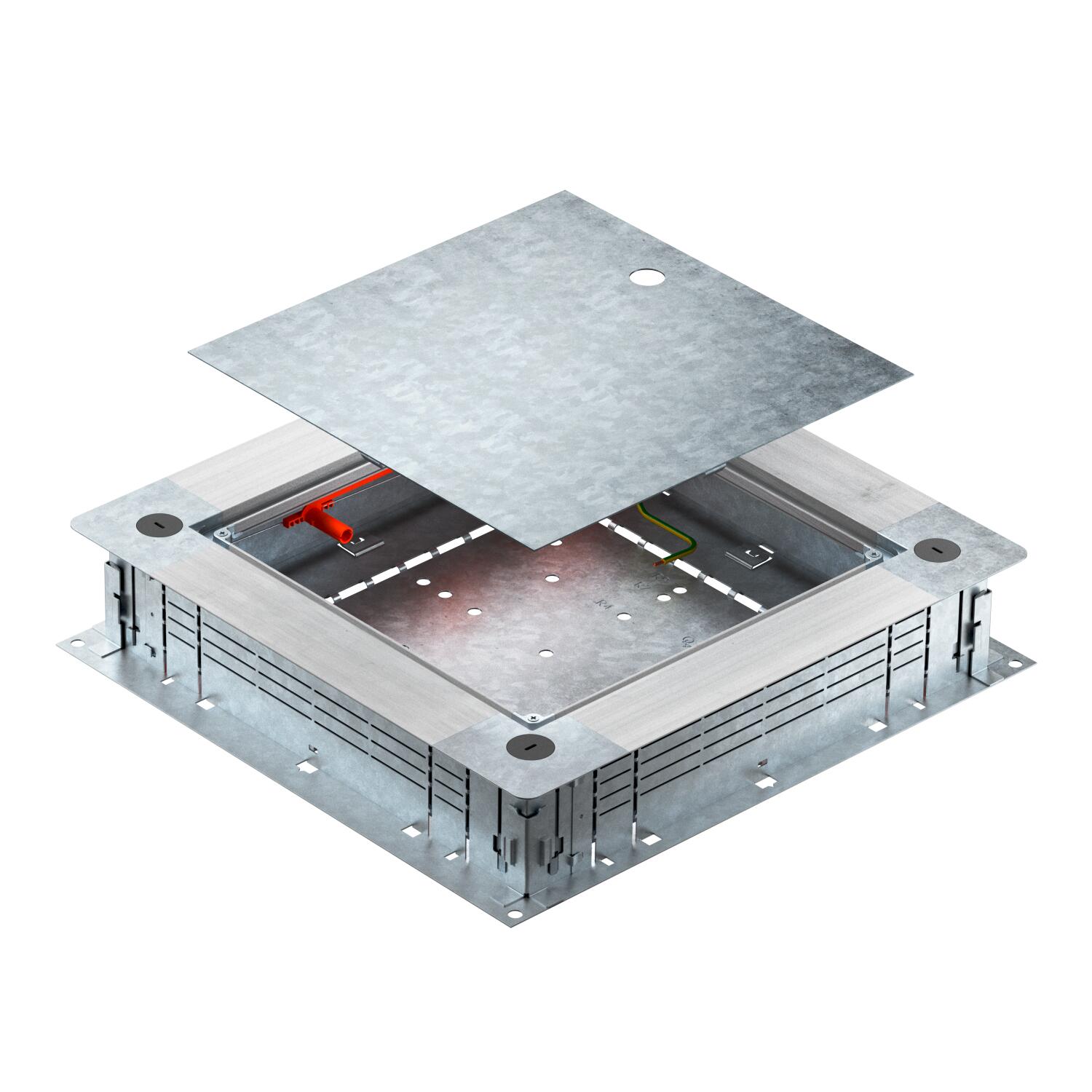 Opis proizvodaVezna i razvodna kutija za podne instalacione kanale ispod betonske košuljice sa bočnim stranicama od čeličnog lima. Za montažu ugradnih jedinica u montažni poklopac (naručuje se posebno). Može da se niveliše kontinualno sa brzom nivelacijom na visinu betonske košuljice od 80 - 160 mm. Betonska košuljica može da se obradi u ravni sa ivicom poda. Sa opcijom akustičkog odvajanja nakon ugradnje betonske košuljice, a uz pomoć sistemskog pribora, može da se koristit i za velika opterećenja. Uvođenje kablova i vodova pomoću 2-delnog EÜK kanala.