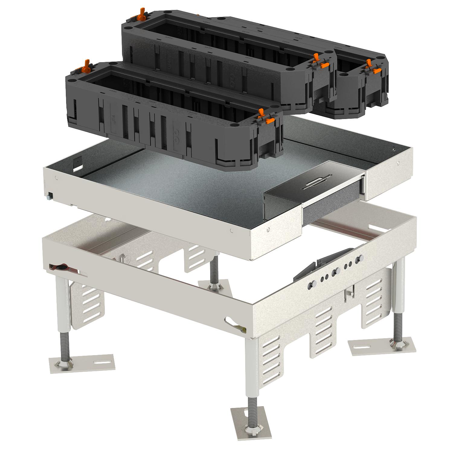 Opis proizvodaPodna kutija podesiva po visini sa svim potrebnim sistemskim priborom za direktnu ugradnju u sve vrste podova sa suvo održavanim podnim oblogama u zatvorenom.