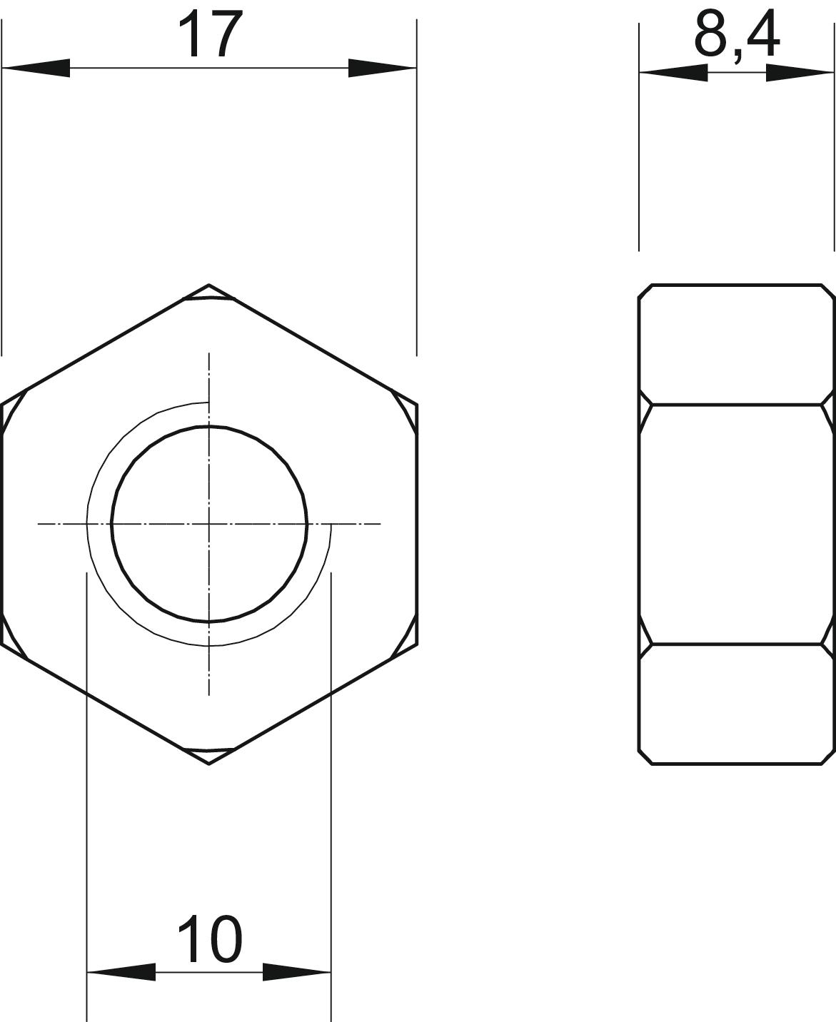bez halogena da CO2 otisak (GWP) od kolevke do kapije 0,0502 kg CO2e / 1 Komad Dimenzija M10 Dimenzija D 10 mm Dimenzija h 8,4 mm Imperijalni navoj 3/8 cola Levi navoj ne Materijal Oplemenjeni čelik, nerđajući Metrički navoj 10 Navoj M10 Navrtka vijčanog sistema Spoljni šestougao Površina svetlo, naknadno obrađeno S prirubnicom ne Samoosiguravajuće ne širina ključa 17 Varijanta navrtke Navrtka Vrsta navoja metrički - Svi tipovi