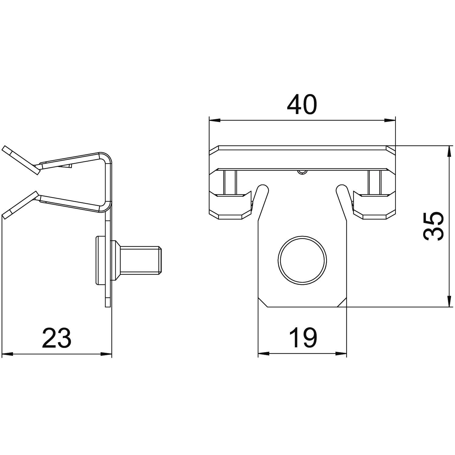 Opis proizvodaStezaljka nosača sa bočnim navojnim tiplom M6, za za individualna montažna rešenja. Učvršćivanje na čelične nosače zakivanjem.
