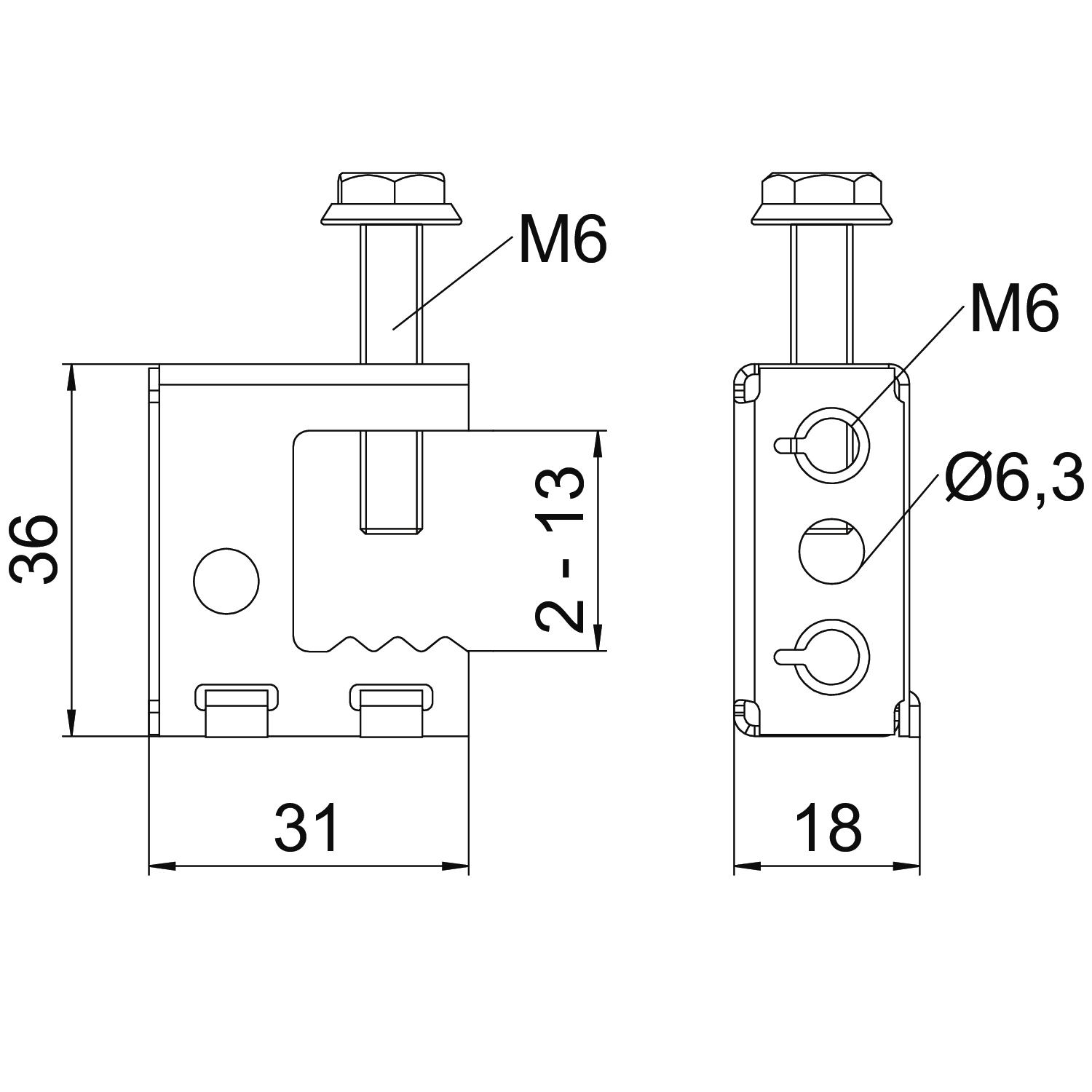 Boja cink Debljina prirubnice F maks. 16 mm Debljina prirubnice F min. 2 mm Dimenzija 2-13mm Dužina 31 mm Maksimalna nosivost 0,55 kN Materijal Čelik Metrički navoj 6 Navoj M6 Podesivi zglob ne Površina Listići od cinka Širina 18 mm Visina 36 mm Vrsta pričvršćivanja naviti Vrsta priključka/komponente ostalo Zglobno ne - Svi tipovi