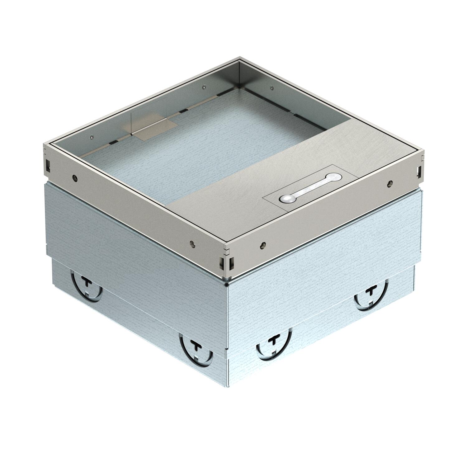 Opis proizvodaSquare floor socket for use in dry-care cavity and screed floors in indoor areas. Installation housing with pre-marked insertion openings for pipes (M20/M25). Cover adjustable to top edge of floor covering using four height-adjustment supports. The minimum installation depth is 110 mm, the height-adjustment range 25 mm. Frame and cover made of stainless steel and visible in the floor covering. Cover with floor covering recess and brush bar for cable routing. Empty housing for up to 2 Modul 45® devices in the mounting support and 2 data sockets in the optional data technology support.