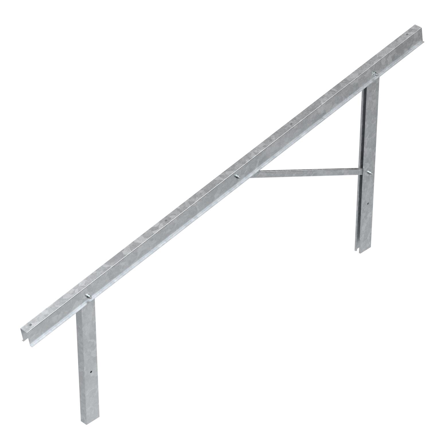 Opis proizvodaUnapred montirani nosači u malim, srednjim ili velikim verzijama za montažu fotonaponskih sistema sa slobodnim poljem u kombinaciji sa profilima nosača i krajnjim/srednjim stezaljkama. Montaža sa profilima ojačanja u tlu ili sa postoljima na betonskim temeljima.