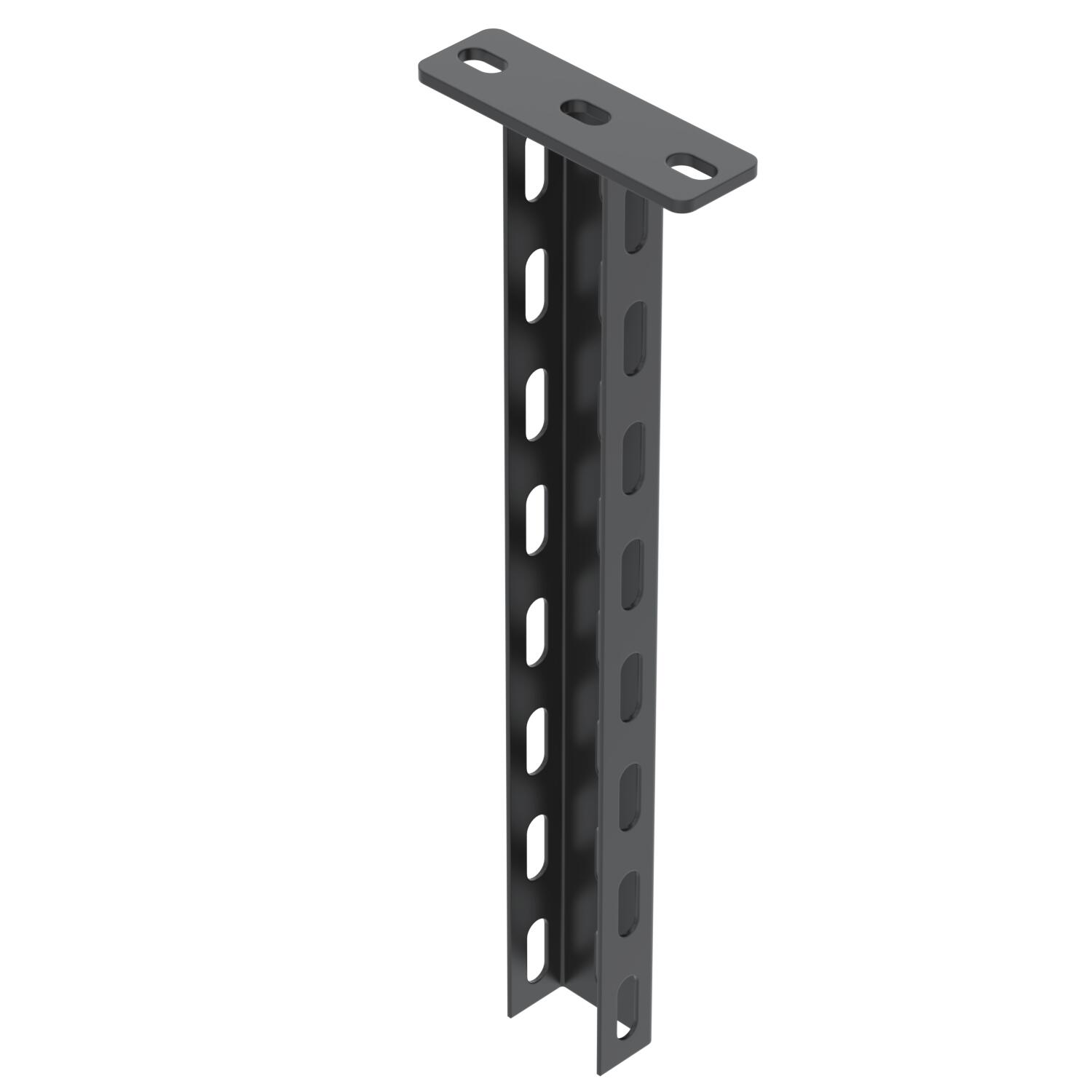Opis proizvodaViseći stub (U-profil) dimenzija 50 k 30 mm sa zavarenom čeonom pločom. Za pričvršćivanje na horizontalne betonske plafone i čelične nosače. Praškasto obojen tamno crnom (RAL 9005). Od širine konzole 400mm ili montaže konzole na kraju plafonskog nosača, preporučuje se primena odstojnika tipa DSK 25.
