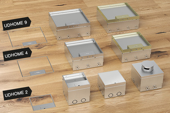 Ugradne jedinice UDHOME4 i UDHOME9 predstavljaju savršeno rešenje za suvo održavane podne obloge i ističu se velikom raznovrsnošću u opremanju. Ugradne jedinice nude dosta prostora za instalaciju strujnih, računarskih i multimedijalnih priključaka. Podne kutije UDHOME2 dimenzija 140x140 mm objedinjuju elegantnu pojavu i funkcionalnost.